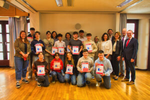 Die glücklichen Gewinner des Schülerwettbewerbs „Planspiel Börse“ mit dem stellvertretenden Vorstandsvorsitzendem der Sparkasse Niederbayern-Mitte Dr. Martin Kreuzer (1.v.r) und Wertpapier-Experten Josef Brunner (4.v.r).
